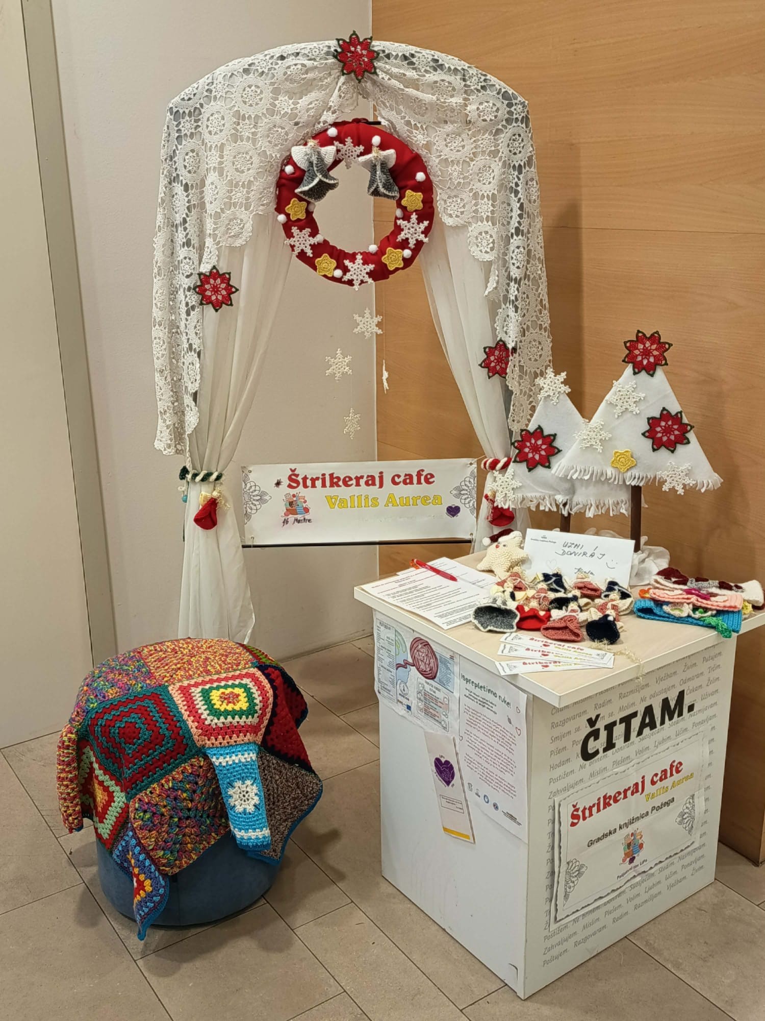 Na mjesto Jelke Anđelke u knjižnici je postavljen Adventski prozorčić i kutak sa heklanim radovima koje si posjetitelji kutka mogu uzeti a donirati prema mogućnostima i na taj način podržati rad Štrikeraja.